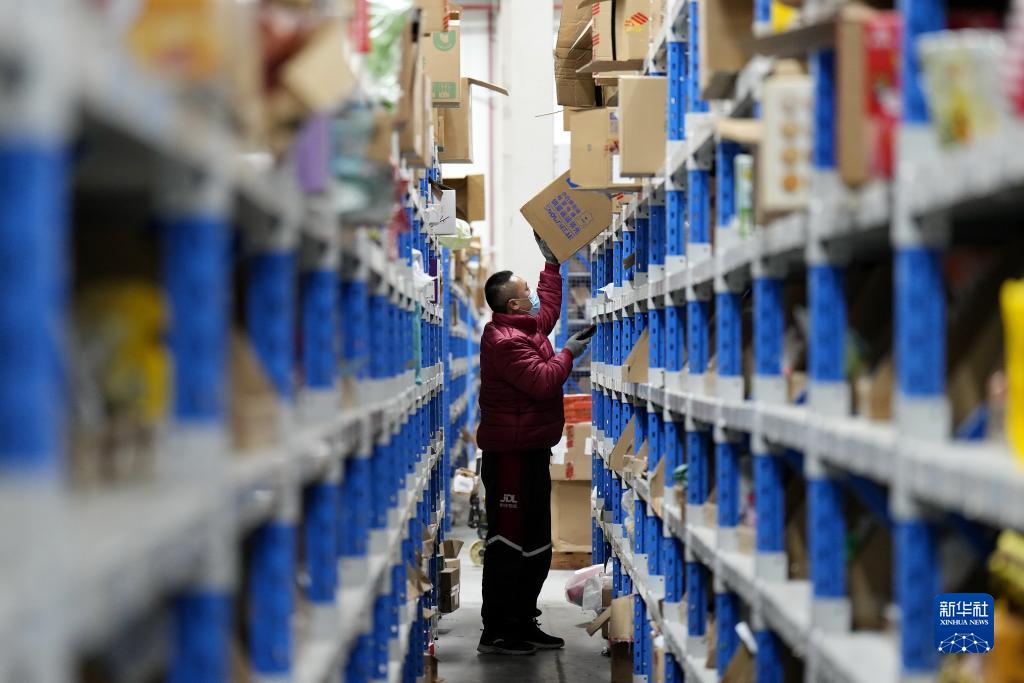 11月16日,在普洛斯唐山丰润物流园,京东物流的工作人员在货柜上查验商品。