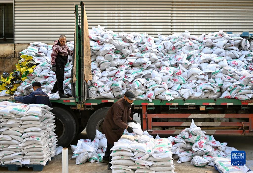 11月16日,在位于唐山市丰润区的唐山公路港物流有限公司,工人在整理农资产品。