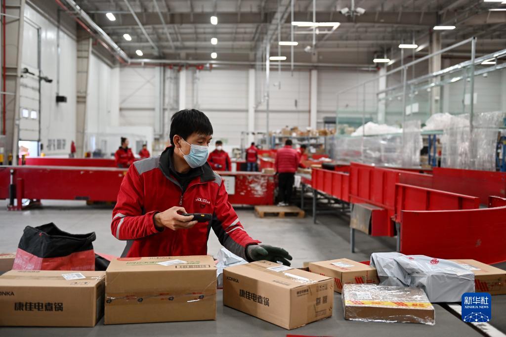 11月16日,在普洛斯唐山丰润物流园,京东物流的工作人员在发送商品。
