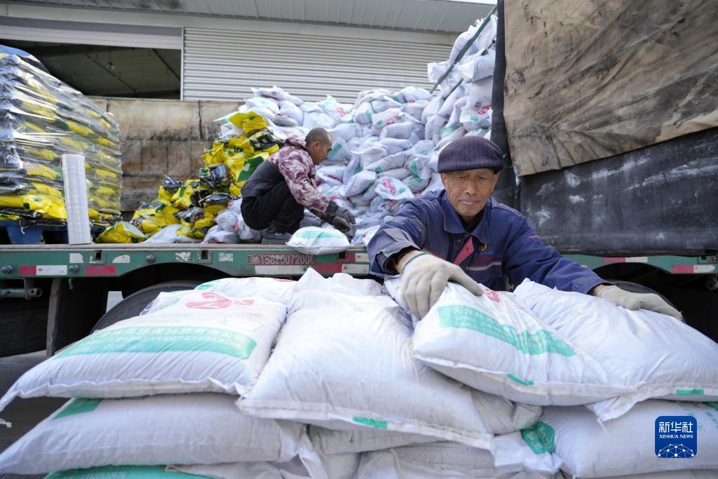 11月16日,在位于唐山市丰润区的唐山公路港物流有限公司,工人在整理农资产品。