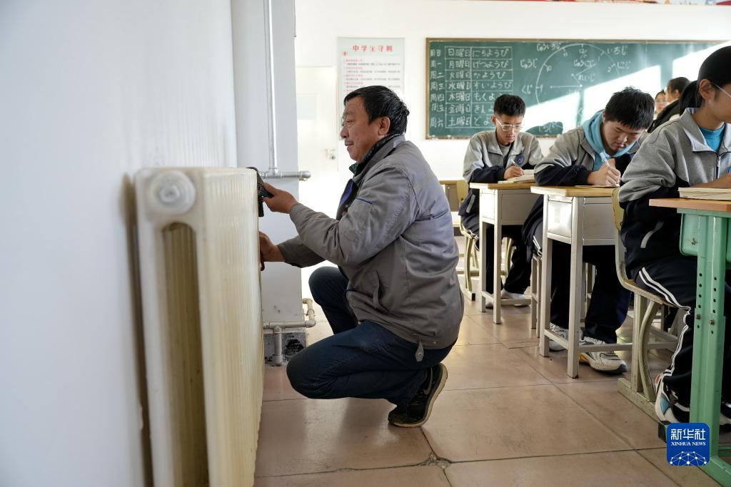 11月16日,唐山市丰润区一家供热企业工人在丰润区第二中学教室内检修供热设备。