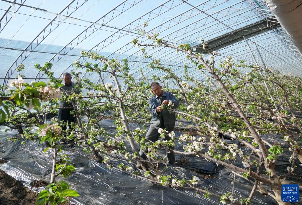近日,河北省乐亭县丞起现代农业园区不同花期的樱桃树开花、结果,果农忙着管护、采摘,大棚内一派忙碌景象。近年来,乐亭县引导农民采取“合作社+农户”的模式种植大棚樱桃、桃、葡萄等果品,促进农民增收。