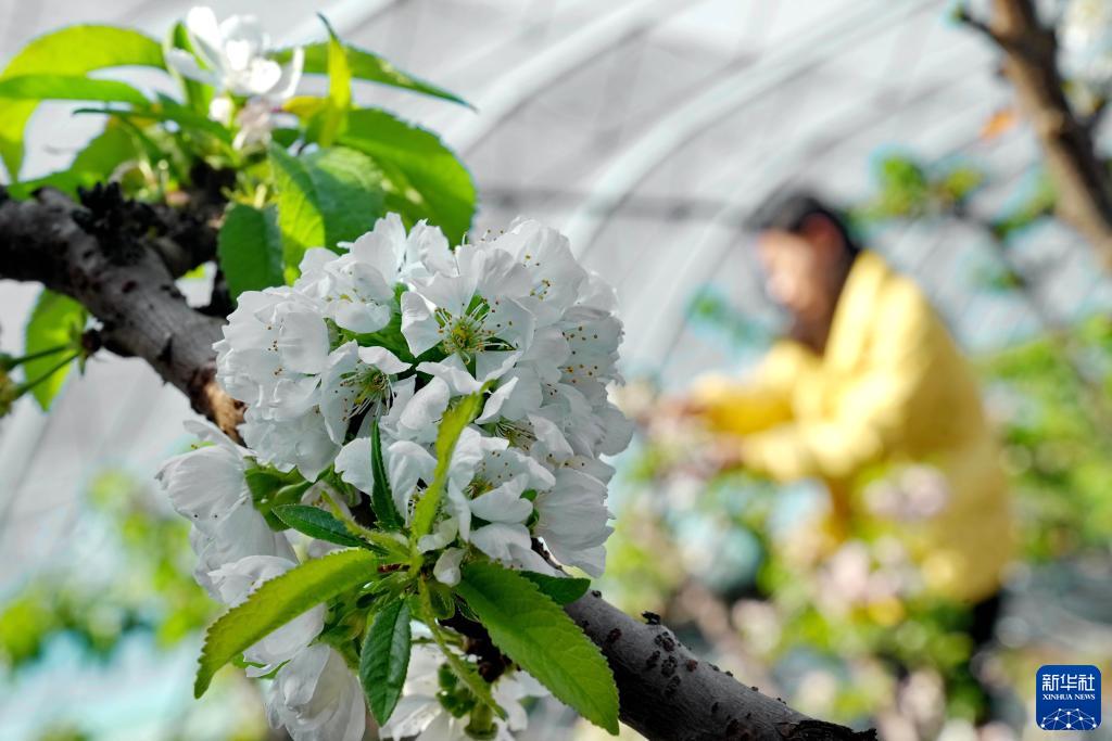 近日,河北省乐亭县丞起现代农业园区不同花期的樱桃树开花、结果,果农忙着管护、采摘,大棚内一派忙碌景象。近年来,乐亭县引导农民采取“合作社+农户”的模式种植大棚樱桃、桃、葡萄等果品,促进农民增收。
