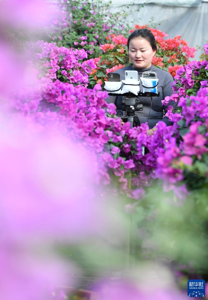 11月16日,在沭阳县颜集镇堰下村幸福花海电商直播基地,村民在进行网络直播。