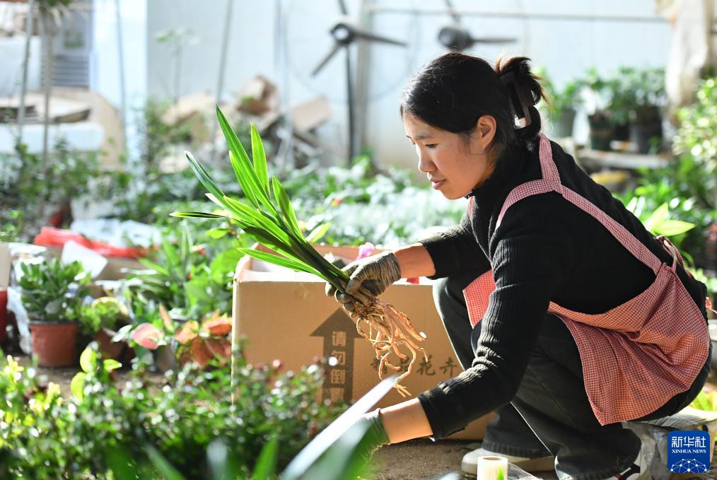 11月16日,在沭阳县颜集镇堰下村幸福花海电商直播基地,花农在包装花卉。
