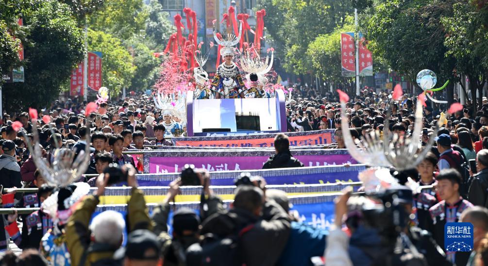 11月16日,在雷山县县城,苗族群众身着盛装,载歌载舞参加苗年和鼓藏节的巡游活动。