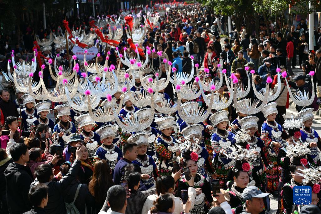 当日,贵州省黔东南苗族侗族自治州雷山县迎来苗族同胞的传统节日苗年。今年苗年又恰逢十三年一次的鼓藏节,欢乐气氛格外浓烈。来自县内外的数万名苗族群众欢聚雷山县城,通过盛装巡游、非遗展示、千人长桌宴等形式欢度节日。苗年和鼓藏节均为国家级非物质文化遗产。