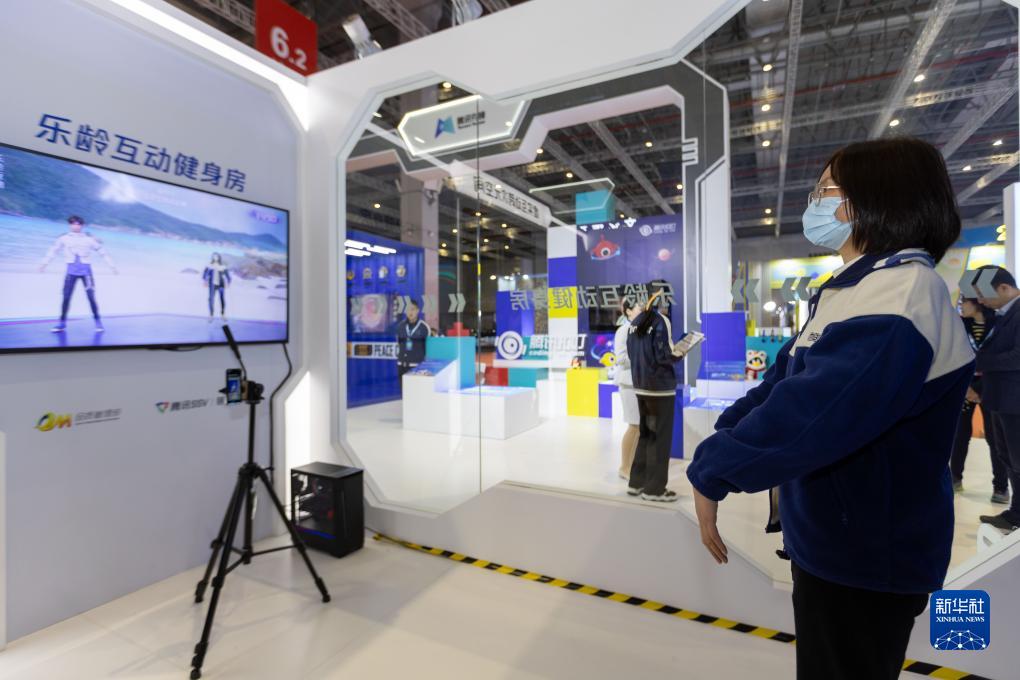 11月16日,人们在腾讯展位体验虚拟健身房运动。