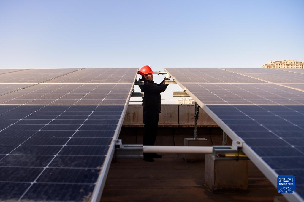 11月16日,工作人员在海勃湾区人民政府大楼屋顶检查光伏设备。