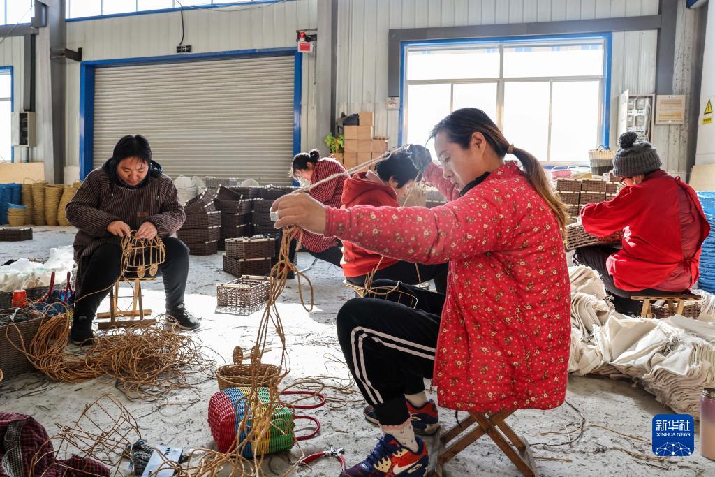 11月16日,东平县老湖镇水浒安置社区居民在手作加工点加工藤编产品。