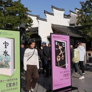 11月17日,人们从乌镇景区展示的茅盾文学奖获奖作品展板旁走过。