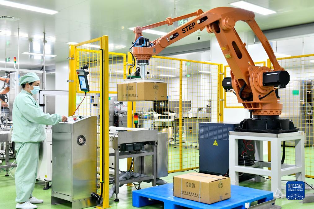 7月7日,在菏泽了未元生物医药大健康产业园,工业机器人从生产线上搬运成品药箱。