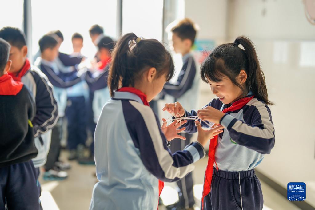 11月17日,河北省唐山市路北区橡树湾小学学生利用课间时间玩翻花绳。