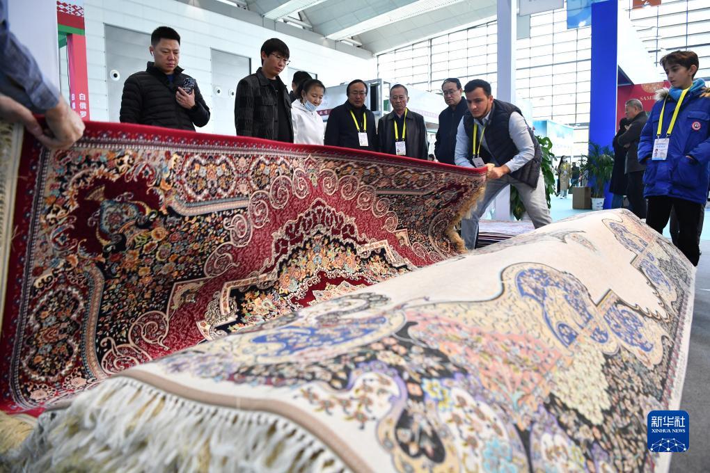 11月16日,观众在伊朗展位上选购地毯。