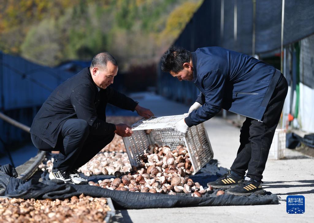 11月17日,农户在宁陕县城关镇一处香菇种植园区晾晒香菇。