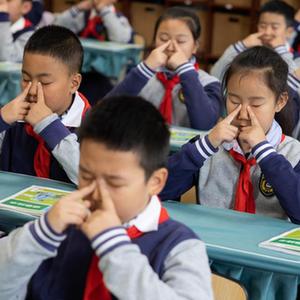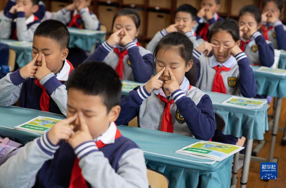 11月17日,在成都市迎宾路小学,四年级一班的同学们在课间做眼保健操。