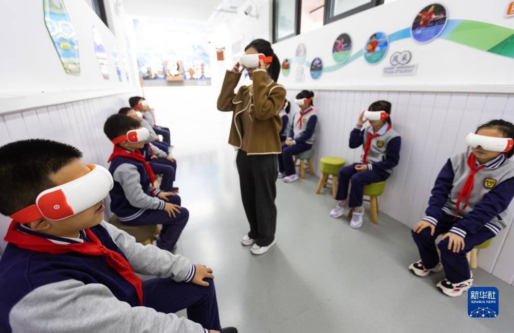 11月17日,在成都市迎宾路小学健康空间,健康老师带领学生体验眼睛按摩仪。