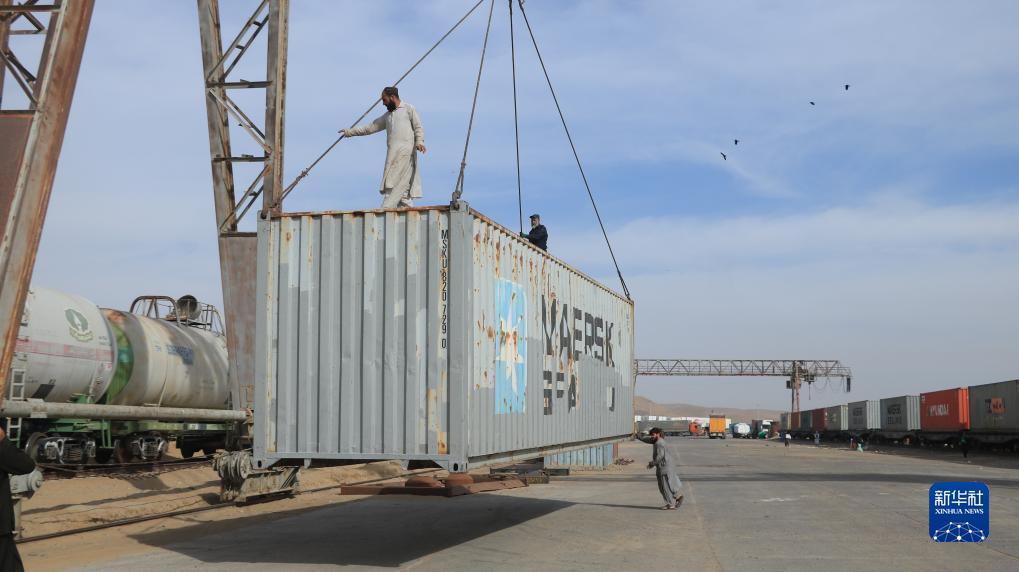 11月16日,在阿富汗西北部赫拉特省托尔贡迪口岸,工作人员卸载中国援阿抗震救灾物资。