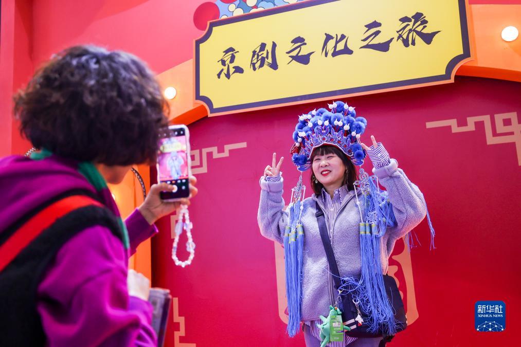 11月17日,参观者在2023中国国际旅游交易会北京展区体验佩戴京剧头饰。