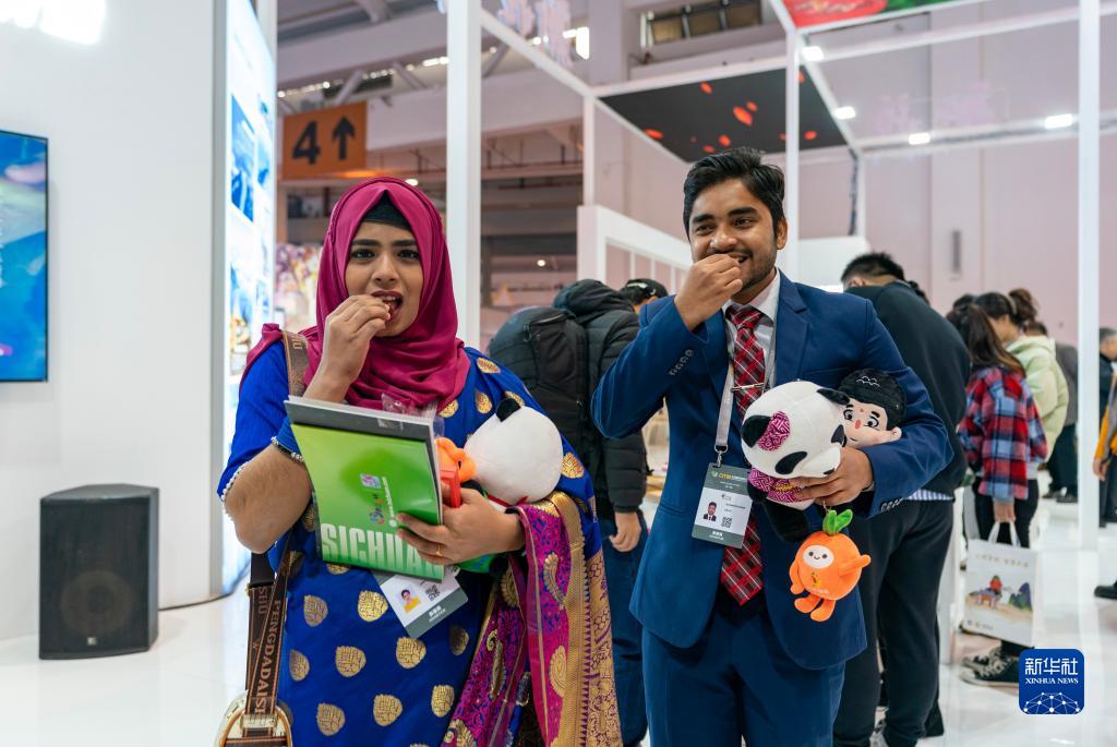 11月17日,两名来自孟加拉国的参展商在2023中国国际旅游交易会上品尝来自新疆的红枣。
