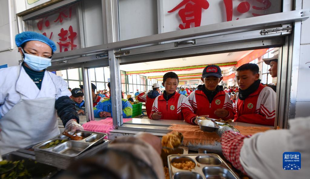 当雄县中学的学生在学校食堂打午饭(11月10日摄)。