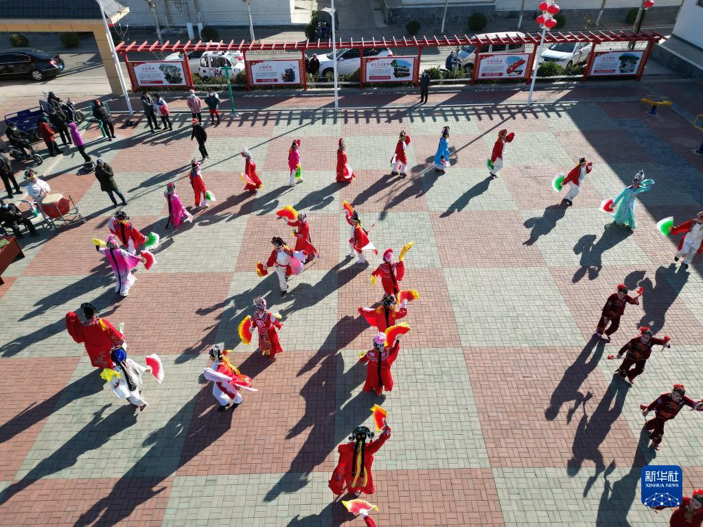 11月17日,河北省滦州市葛庄村地秧歌队队员在村广场上表演(无人机照片)。