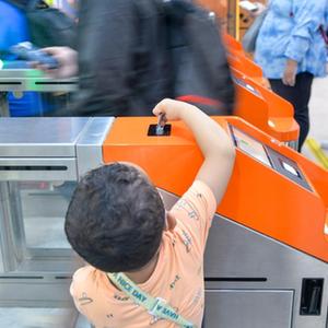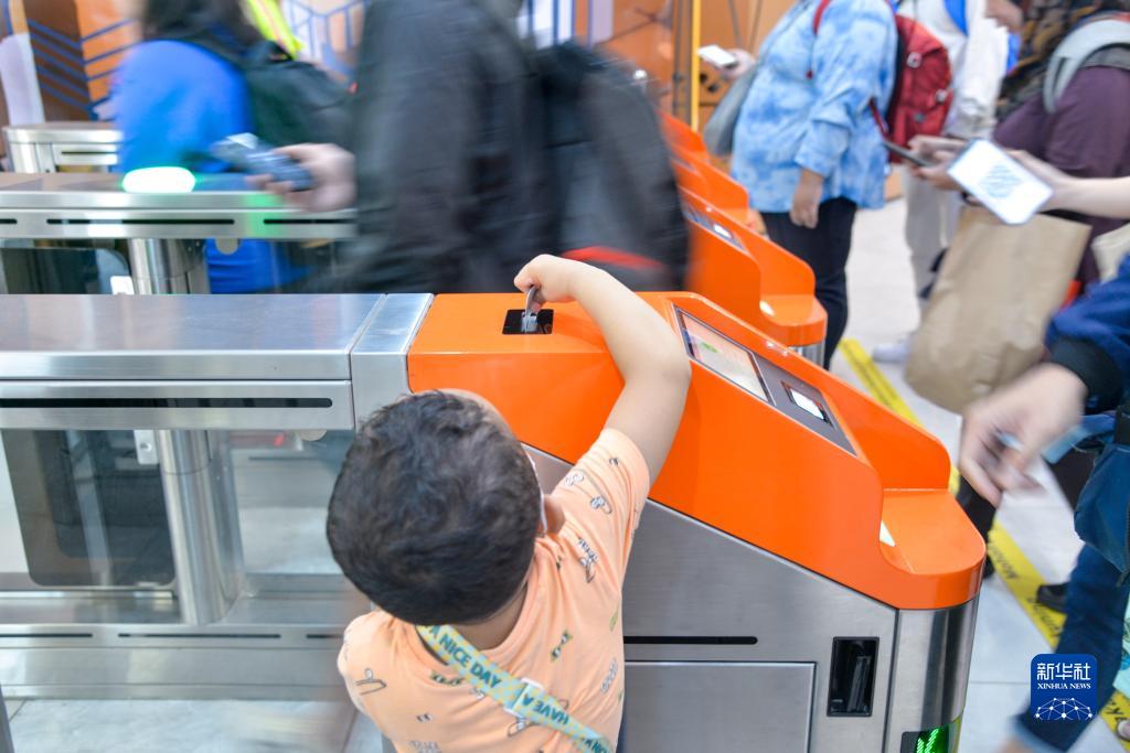 11月17日,在印度尼西亚雅加达的雅万高铁哈利姆站候车大厅,一名小朋友刷票前往站台。