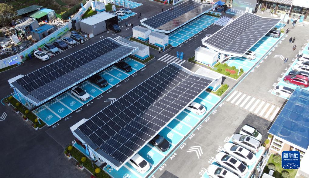 11月17日拍摄的安徽石油大众综合能源站内的充电车棚,车棚也可作为光伏发电站(无人机照片)。