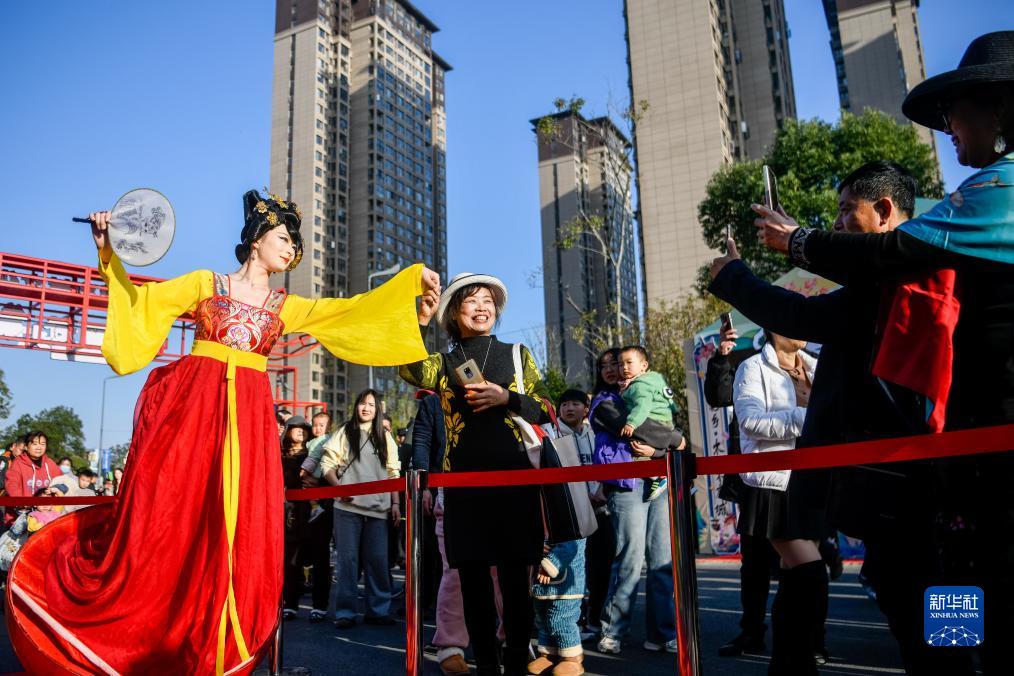 11月17日,在第四届荆楚乡村文化旅游节集市上,游客在观看表演。