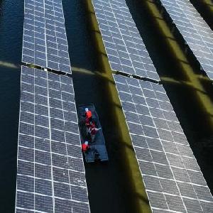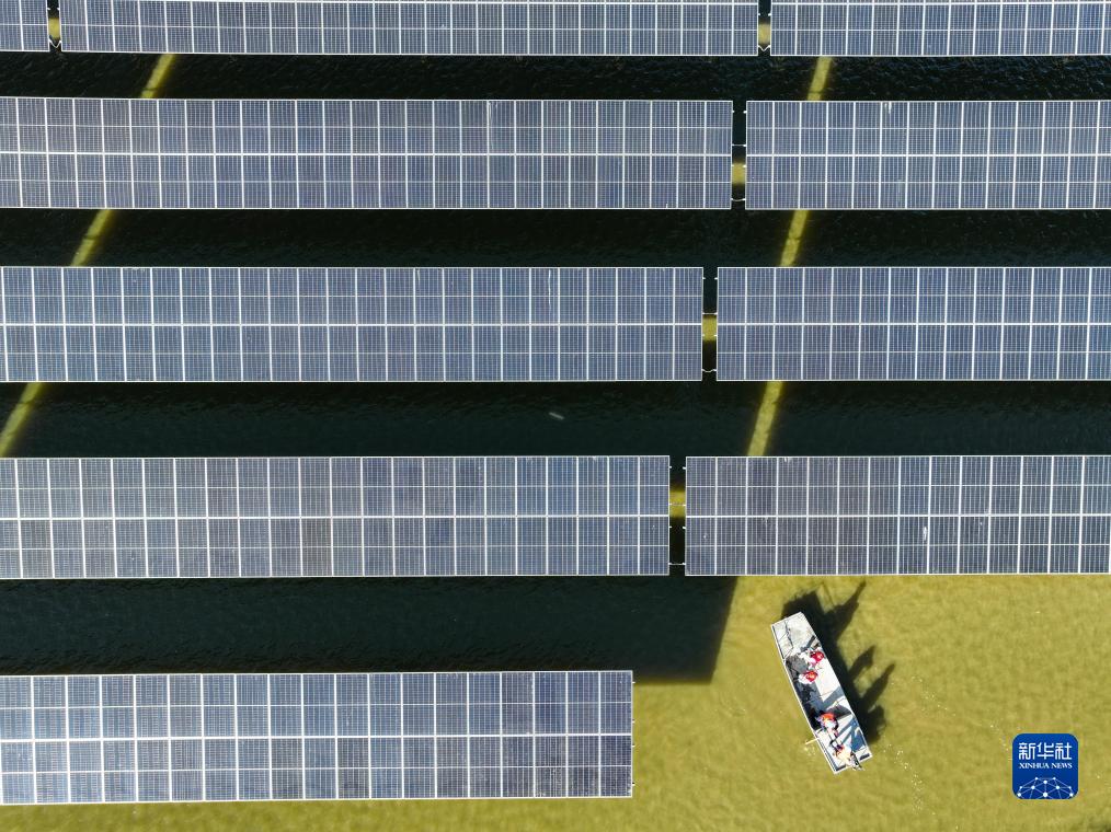 11月17日,在连云港市灌云县圩丰镇洋桥村,国网连云港供电公司员工对渔光互补发电项目进行巡检(无人机照片)。