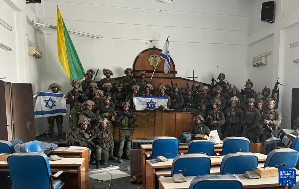 这张以色列媒体11月13日刊发的照片显示,以色列国防军士兵在加沙城巴勒斯坦伊斯兰抵抗运动(哈马斯)立法委员会大楼里举着以色列国旗。