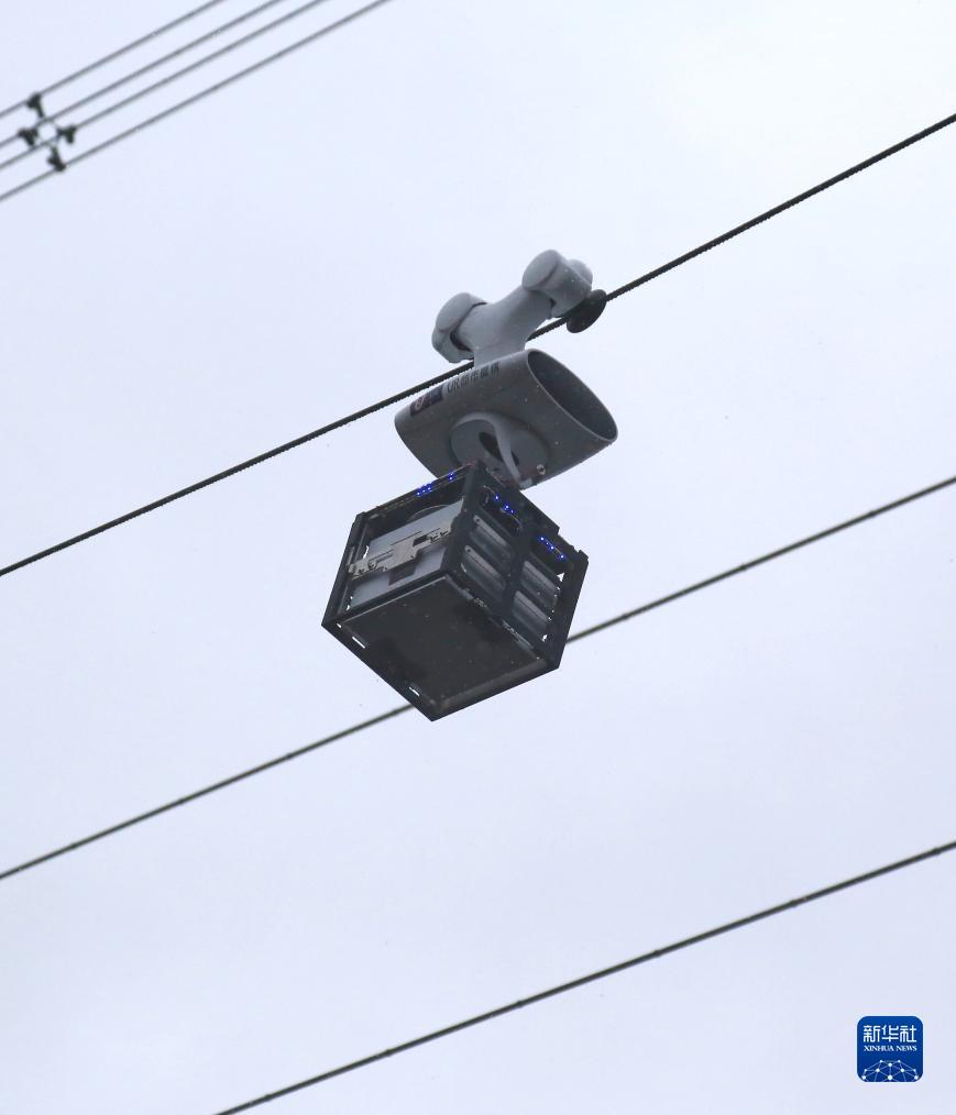 11月17日,在日本川崎市,空中索道机器人在面向媒体的试验说明会上演示运送商品。