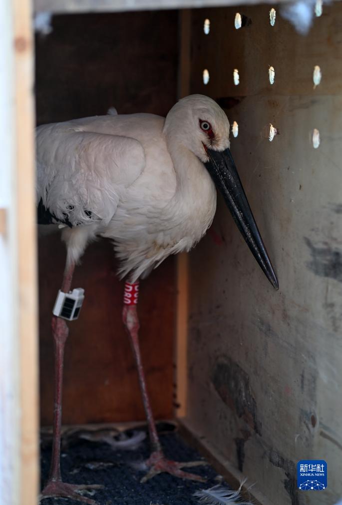 11月18日,一只被救助的东方白鹳在木箱里。
