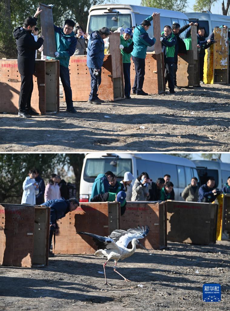 11月18日,工作人员打开木门将东方白鹳放归自然(拼版照片)。