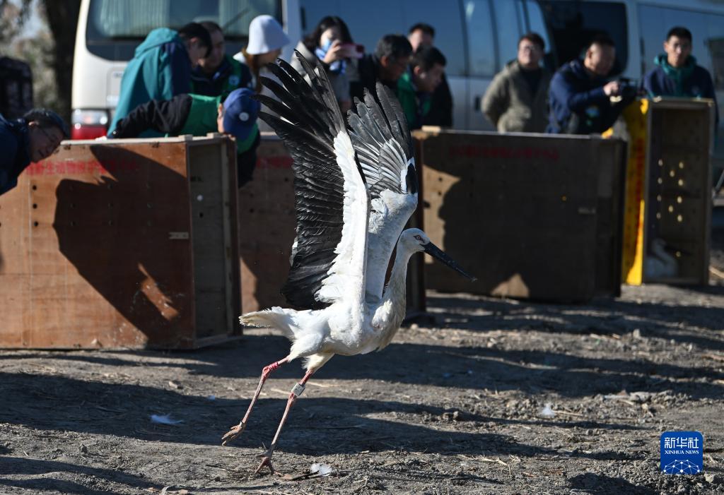 11月18日,一只被救助的东方白鹳振翅起飞。