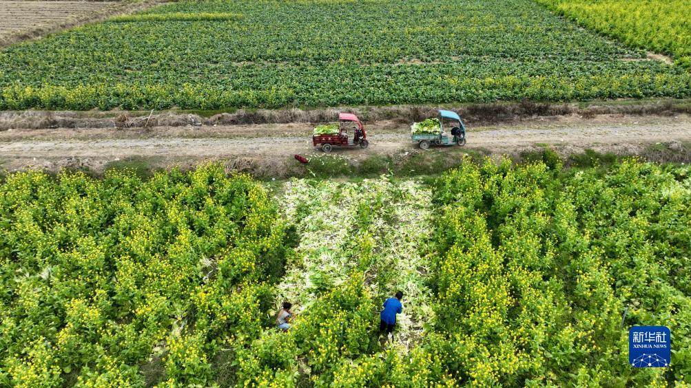 11月18日,村民在贵州省黔东南苗族侗族自治州榕江县车江万亩大坝采收菜苔(无人机照片)。