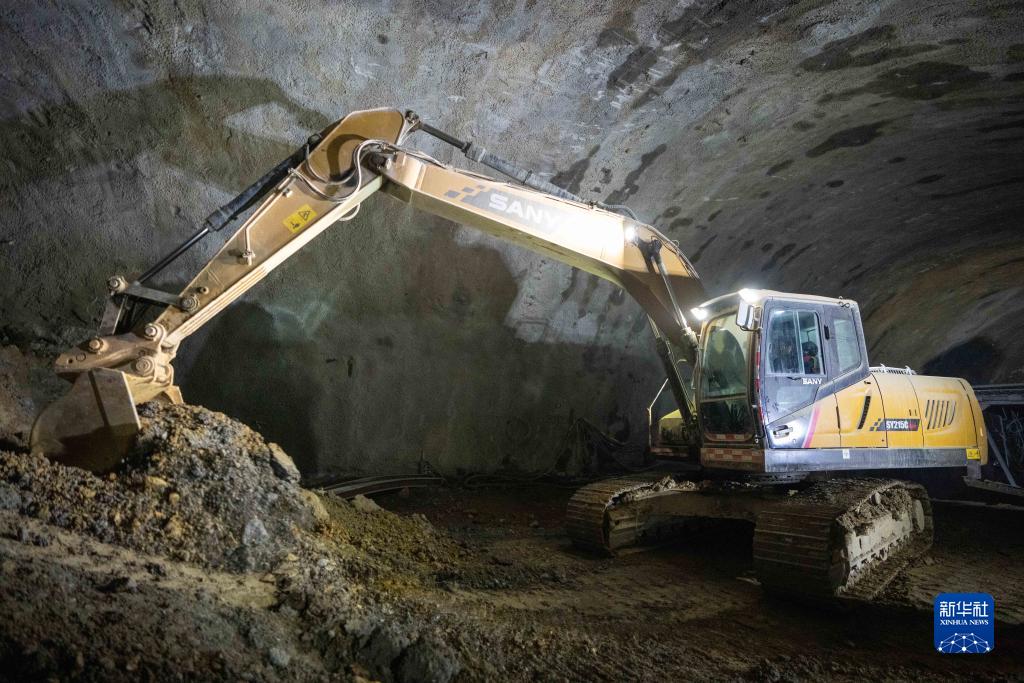 11月19日,中铁五局施工人员操作挖机在桑龙高速金家坡二号隧道内施工。