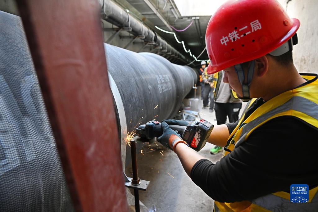 中铁二局建设者在青岛市唐河路——安顺路打通工程(涉铁段)综合管廊内施工(11月20日摄)。