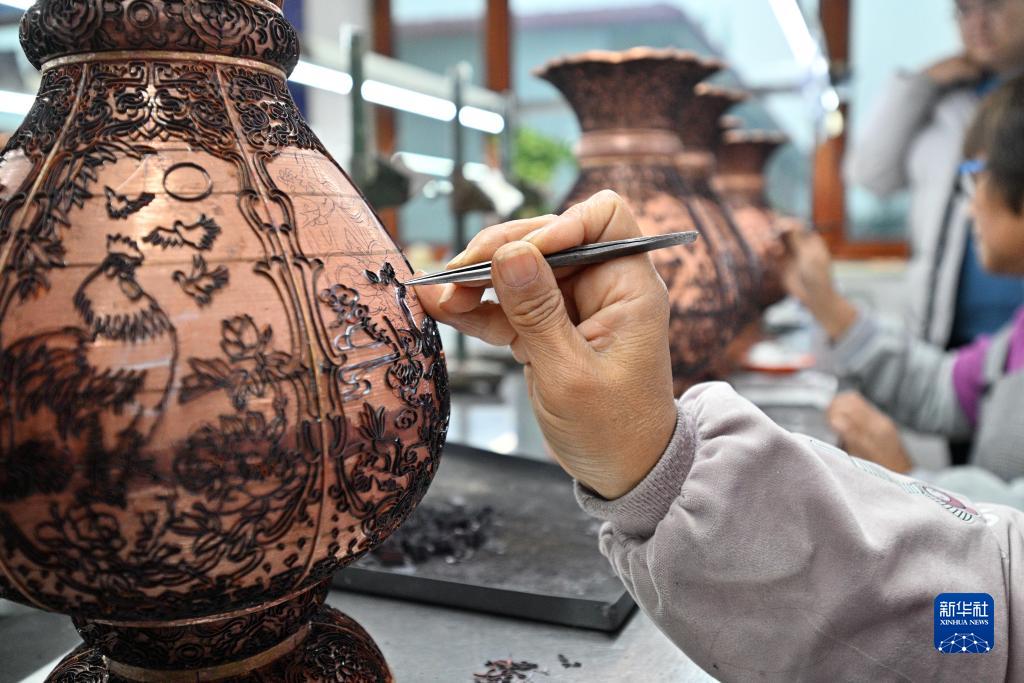 11月20日,在饶阳亿泽景泰蓝工艺品厂,工人在进行“掐丝”。