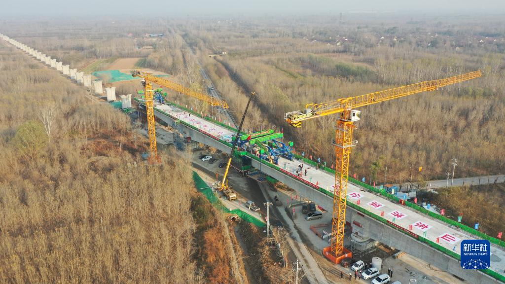 11月20日,在济滨高铁商惠滨2号特大桥,山东路桥集团的工作人员在进行桥梁合龙作业(无人机照片)。