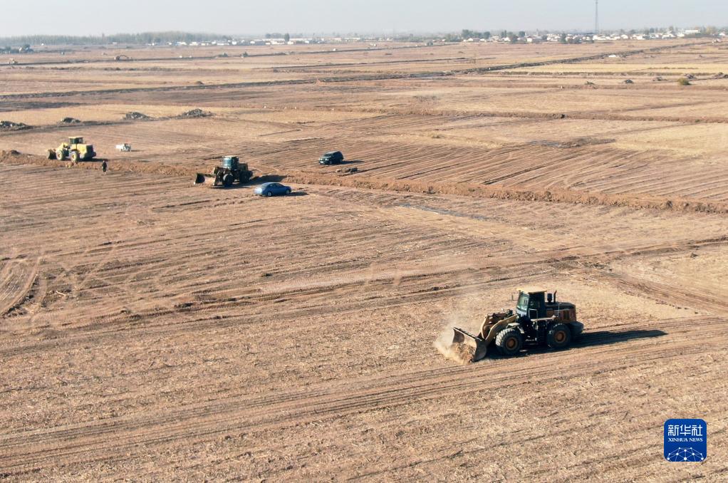 11月15日,内蒙古巴彦淖尔市杭锦后旗蛮会镇公益渠村进行高标准农田建设(无人机拍摄)。