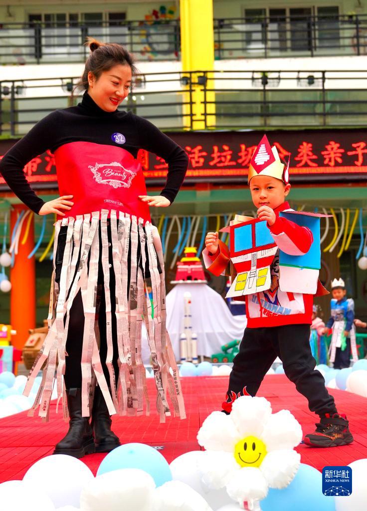 当日,四川省泸州市龙马潭区玉带河幼儿园举办了一场垃圾分类亲子时装秀,小朋友和家长身着用废纸壳、塑料袋、旧报纸等材料制作的各类创意服装走上舞台进行展示,让低碳生活、变废为宝的理念深入幼儿心灵。