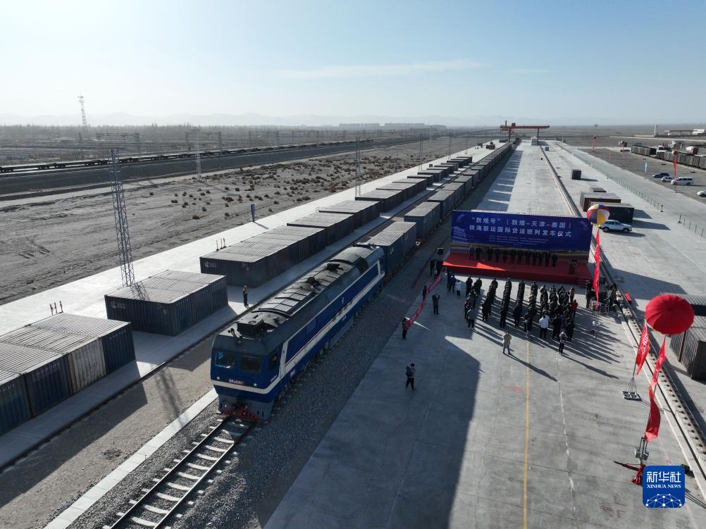 11月21日,首趟“敦煌号”(敦煌-天津港-泰国)铁海联运国际货运班列在敦煌铁路西货站综合货场等待发车(无人机照片)。