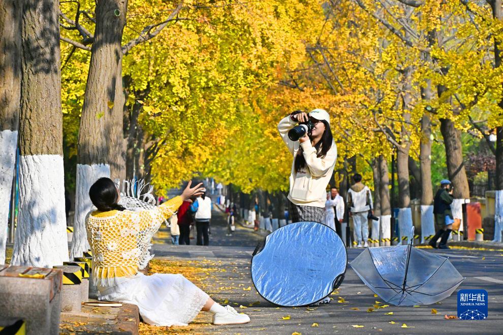 初冬时节,青岛八大关景区银杏大道染满金黄,不少市民和游客纷纷前来赏叶、观景,享受冬日暖阳带来的惬意与美好。
