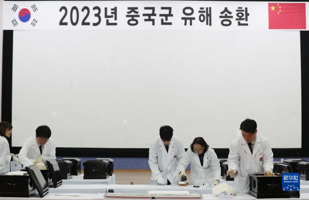11月22日,在韩国仁川,韩方工作人员将志愿军烈士遗骸入殓。