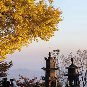 杭坞山位于浙江省诸暨市北部店口、次坞、姚江三镇交界处,海拔500多米。初冬时节,杭坞山顶三德寺门外有着500年和300年树龄的两株古银杏金黄满树,成为当地山乡美丽的风景。