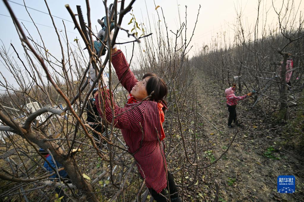 技术工人在威县贺营镇红龙集村的梨园里剪枝(11月21日摄)。