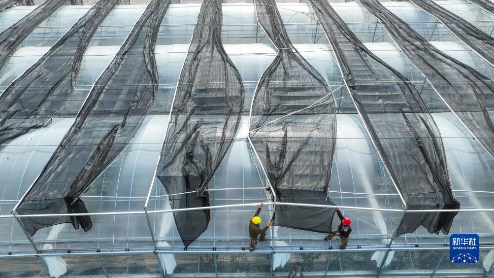 11月22日,河北省遵化市石门镇农民在苫盖设施大棚(无人机照片)。