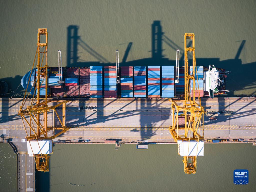 11月22日,货轮停靠在温州港状元岙集装箱码头卸载集装箱(无人机照片)。