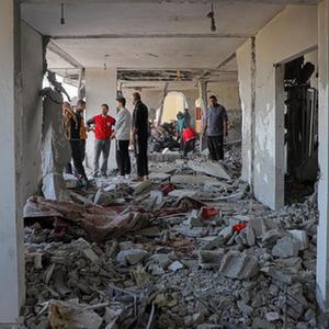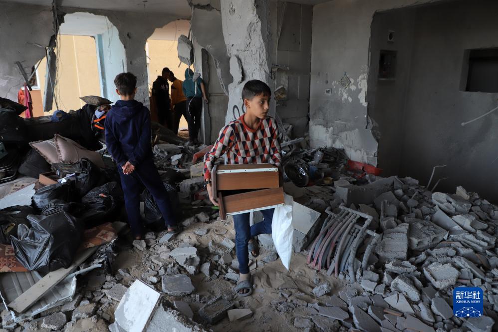 11月22日,在加沙地带南部城市汗尤尼斯,巴勒斯坦人查看遭以色列袭击后的建筑废墟。